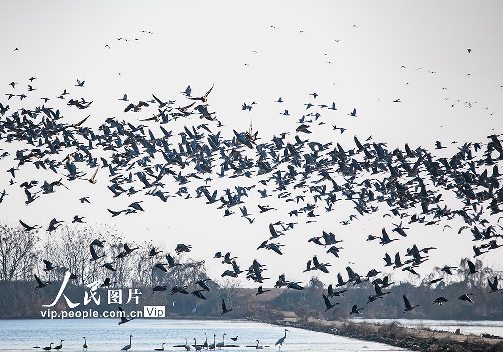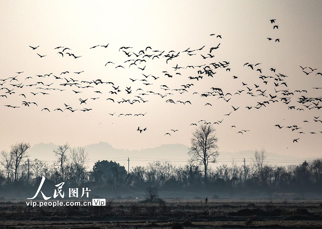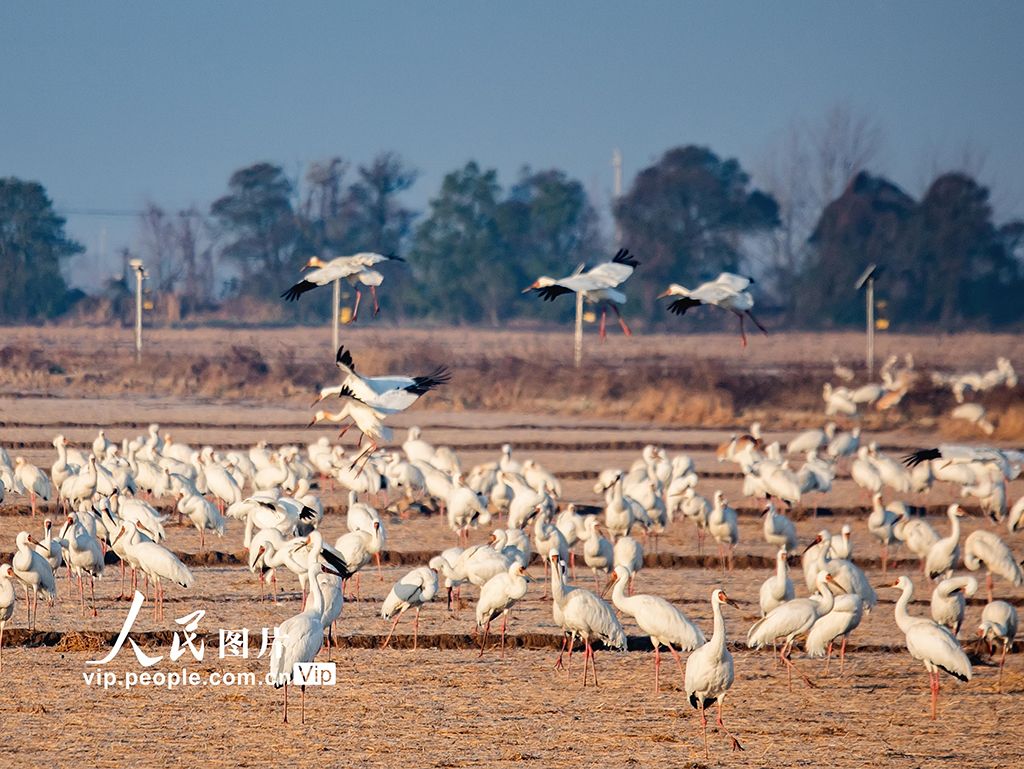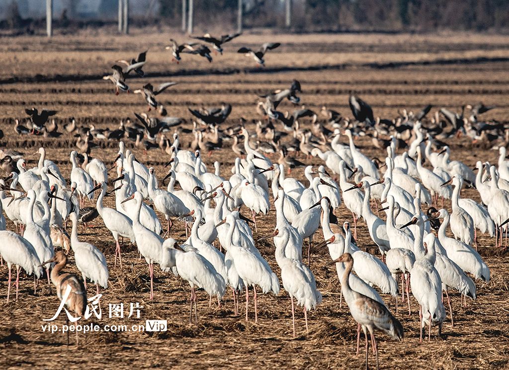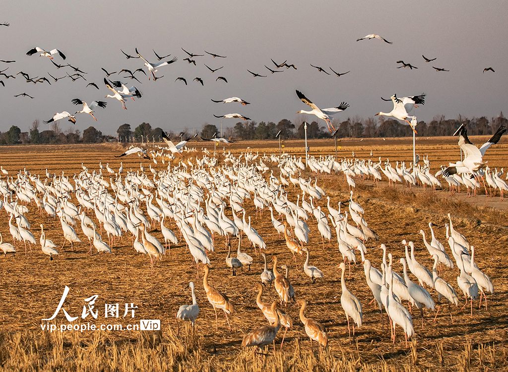 2026年1月7日,江西省上饒市余干縣白鶴洲,數(shù)以萬計的白鶴、鴻雁、豆雁、東方白鸛等野生鳥類或在空中飛舞,或在田間覓食,呈現(xiàn)出一幅美麗的自然生態(tài)畫卷。邵光明攝(人民圖片網(wǎng))